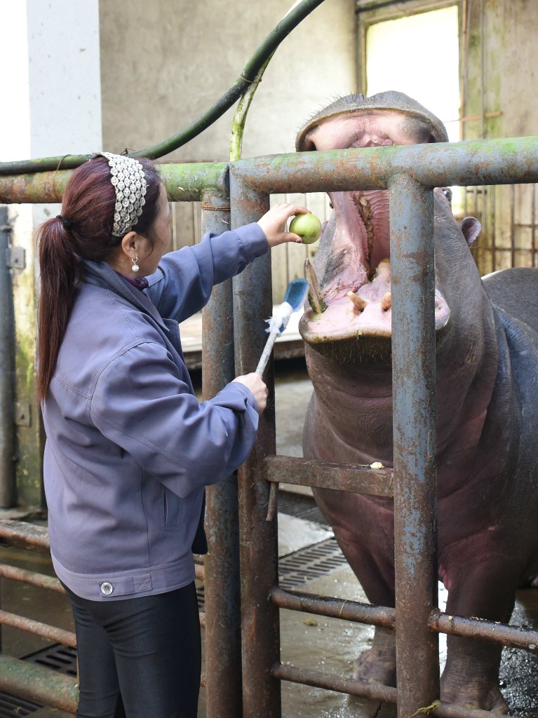 對(duì)于成年河馬除了身高體重測(cè)量,還要多加一項(xiàng)口腔檢查??纯茨菑堦懮溉閯?dòng)物中最大的嘴里,口腔、牙齒是否健康。為更好觀察細(xì)節(jié)會(huì)先給河馬刷牙,河馬們對(duì)這種健康又舒適的特殊服務(wù)十分歡迎。