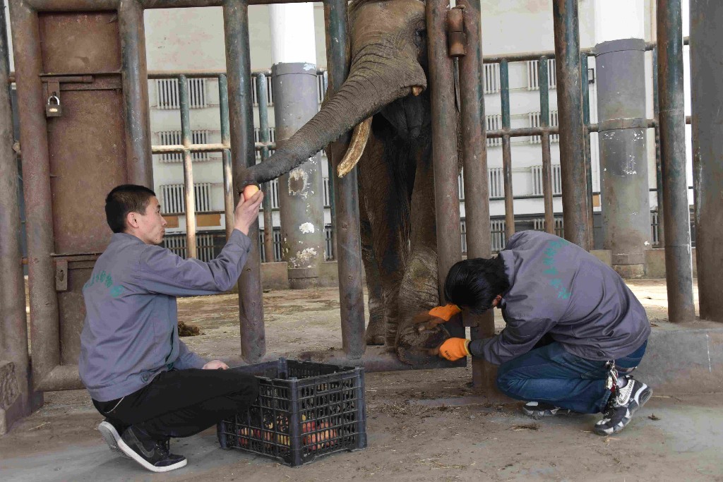 非洲象“豆豆”今年11歲,還在長(zhǎng)身體。這次體檢發(fā)現(xiàn),一個(gè)冬天“豆豆”個(gè)子長(zhǎng)了6cm,體重長(zhǎng)了150kg,牙齒長(zhǎng)長(zhǎng),腿長(zhǎng)粗,腳也長(zhǎng)大了。更讓“豆豆”喜歡的是,量完腳還有專(zhuān)業(yè)的修腳服務(wù)。