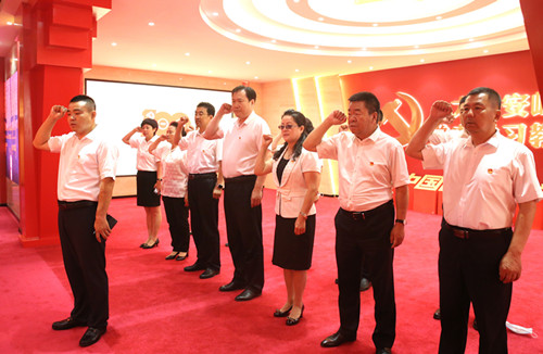 在地區(qū)黨史學(xué)習(xí)教育展館,面對(duì)鮮紅的黨旗,新林區(qū)委書(shū)記領(lǐng)誓,區(qū)委理論學(xué)習(xí)中心組成員集體宣誓,重溫入黨誓詞,砥礪前進(jìn)初心,勇?lián)氊?zé)使命。
