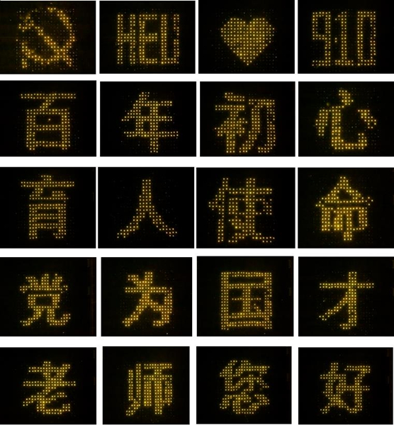 黨徽、HEU(哈工程縮寫)、愛心、9.10、百年初心、育人使命、為黨育人、為國(guó)育才、老師您好……同學(xué)們匯聚力量共同拼出了24組圖案和字樣,即使天空飄起毛毛細(xì)雨,他們也絲毫沒(méi)有變換位置,在雨中足足站了兩個(gè)小時(shí)。2021級(jí)博士生王文軒感慨:“作為一名本、碩都就讀于哈工程的學(xué)生,這所大學(xué)的老師教會(huì)了我如何做人做事做學(xué)問(wèn),我們用這場(chǎng)燈光秀,獻(xiàn)禮我們最尊敬的老師,我們也一定會(huì)傳承哈軍工精神,勇?lián)鷱?qiáng)國(guó)百年使命擔(dān)當(dāng)?!?/span>