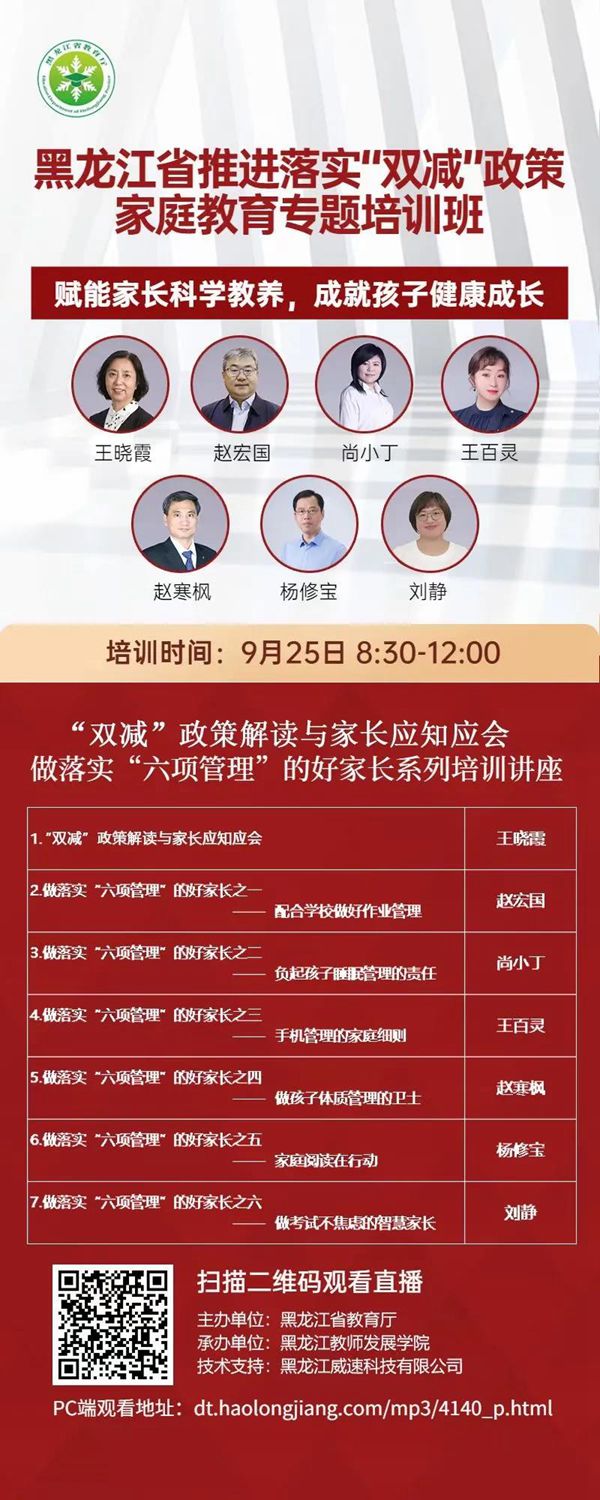 據(jù)了解,此次培訓(xùn)是《黑龍江省中小學(xué)“百萬家庭賦能”工程實(shí)施方案》重要組成部分,也是省教育廳踐行黨史學(xué)習(xí)教育“我為群眾辦實(shí)事”,解決群眾急難愁盼問題的具體舉措,由省教育廳主辦、黑龍江教師發(fā)展學(xué)院承辦,基礎(chǔ)教育處處長(zhǎng)領(lǐng)銜六位家庭教育專家共同開講,時(shí)長(zhǎng)三個(gè)半小時(shí),受到廣大家長(zhǎng)的一致好評(píng),取得良好的社會(huì)反響,直播時(shí)瀏覽峰值達(dá)到210.7萬人次。培訓(xùn)內(nèi)容緊緊圍繞廣大家長(zhǎng)們“雙減”形勢(shì)下的困惑,深入宣傳“雙減”政策和年初以來教育部相繼下發(fā)的關(guān)于手機(jī)、作業(yè)、睡眠、讀物、體質(zhì)、考試等“六項(xiàng)管理”文件內(nèi)容,分七個(gè)專題進(jìn)行深入細(xì)致的家庭教育指導(dǎo),有的放矢地解答家長(zhǎng)“心中所疑”、化解家長(zhǎng)“心中所急”,很多家長(zhǎng)通過家庭學(xué)校群進(jìn)行交流,有的家長(zhǎng)反饋道:“通過觀看直播我們家長(zhǎng)深刻體會(huì)到一定要以身作則,在孩子面前少玩手機(jī),多陪孩子閱讀書籍,多讓孩子進(jìn)行戶外活動(dòng)。”有的家長(zhǎng)則表示,聽了講座深刻理解了孩子成長(zhǎng)的根基深植于家庭教育的道理,家庭教育才是孩子的起跑線,主動(dòng)地配合學(xué)校落實(shí)“雙減”政策,從做好“六項(xiàng)管理”入手科學(xué)優(yōu)化家庭教養(yǎng)方式,減少孩子的校外培訓(xùn)和作業(yè)負(fù)擔(dān),還給孩子一個(gè)幸福的童年,做一名智慧家長(zhǎng)。