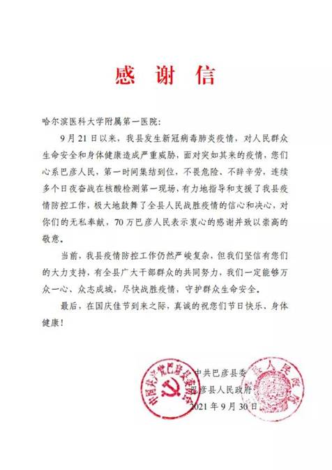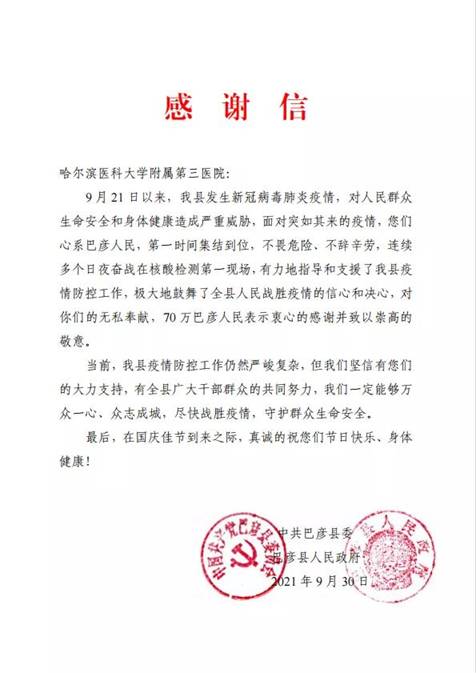 黑龍江經(jīng)濟(jì)網(wǎng)訊(黑龍江日報(bào)全媒體見習(xí)記者董廣碩 商祺)近日,哈爾濱醫(yī)科大學(xué)附屬一院、二院、腫瘤醫(yī)院、四院分別收到巴彥縣委縣政府的感謝信,感謝他們“有力地指導(dǎo)和支援了我縣疫情防控工作,極大地鼓舞了全縣人民戰(zhàn)勝疫情的信心和決心?!?/span>