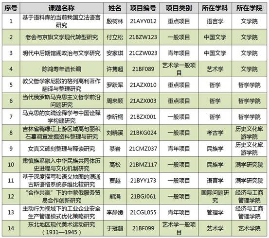 據了解,國家社會科學基金項目是經國務院批準設立,由全國哲學社會科學工作辦公室負責管理,人文社科研究領域中層次最高、資助力度最大、權威性最強的國家級項目,受到學界高度關注。今年黑龍江大學立項的項目總體上有以下幾個特點:一是傳統(tǒng)優(yōu)勢學科立項數量穩(wěn)定增長。中國語言文學獲得4項,哲學獲得3項,與去年比較穩(wěn)中有升,保持了良好的科研發(fā)展態(tài)勢。二是特色學科亮點突出。考古學、民族學、國際問題研究、管理學等學科善于抓住熱點和難點問題,歷年均有斬獲;藝術學獲得2項一般項目,立項數居全省第一位,實現歷史性突破。三是高層次項目數量全省領先。全省共獲重點項目4項,黑大獲得其中3項,立項數占全省總量的75%。國家社科基金重點項目主要資助學術分量厚重、創(chuàng)新性強、對學科發(fā)展具有重要推動作用的研究成果。重點項目數量僅為每年立項總數的8%左右,是衡量科研單位科研能力和水平的重要標志,在各類評估、評比中具有較大權重。四是青年項目占比提高。從項目層次分布上來看,獲3項青年項目,占立項總數的21.4%,居十年來最高水平。