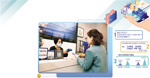 線下場景日益多元的同時,數(shù)字人民幣交易場景也正在發(fā)力線上,形成了“線上+線下”并行推廣的格局。現(xiàn)在,數(shù)字人民幣已經(jīng)可以在京東、美團、滴滴等多個線上場景使用。截至10月22日,已有155萬商戶支持數(shù)字人民幣錢包,涵蓋公共事業(yè)、餐飲服務、交通出行、購物和政務等各個方面。