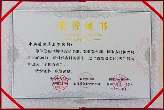塔河縣委宣傳部在2020、2021連續(xù)兩年榮獲“新時(shí)代鄉(xiāng)村閱讀季”全國百強(qiáng)榮譽(yù)稱號,
