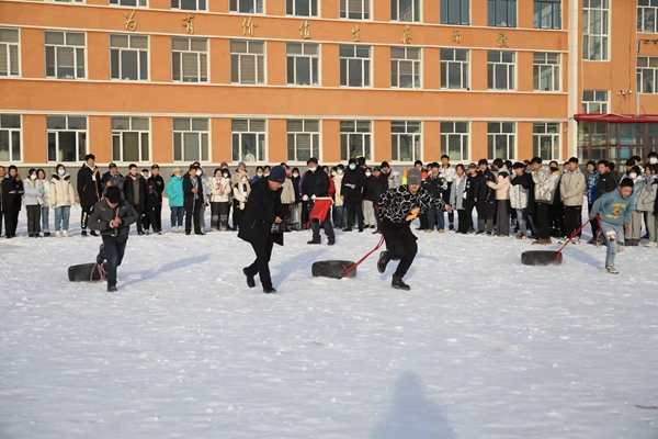 組織開展拉輪胎跑比賽。拉輪胎跑比賽在各年級間進行,每班6名選手,50米往返,以時間少者為勝。隨著裁判老師一聲令下,比賽開始,選手們立馬拉起了輪胎奮力向前沖刺,克服雪地不利的條件,參賽選手飛快地向終點奔跑,掌聲、加油聲響徹操場。冬日的操場上,一個個運動的身影,綻放著最美的光華。
