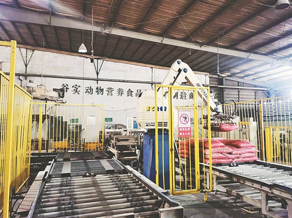 谷實生物集團(tuán)股份有限公司車間里的機(jī)器人碼垛設(shè)備。