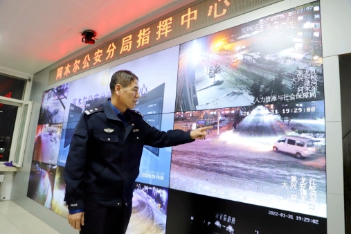 阿木爾公安分局干警在大年三十晚上110指揮中心值班,通過(guò)大型電子顯示屏查看治安情況(王力 攝)