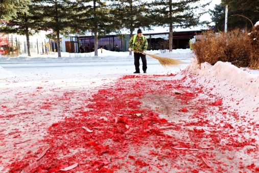 黑龍江經(jīng)濟(jì)網(wǎng)訊(王力 記者馬朝林)天剛蒙蒙亮,呈現(xiàn)眼前的是大年三十夜晚燃放的鞭炮紙屑,遍地開(kāi)花,仿佛是紅地毯一樣。多名環(huán)衛(wèi)工冒著零下30多度的嚴(yán)寒,不顧帽子、眉毛結(jié)滿冰霜,有的用掃帚清掃,有的撿拾紙屑煙頭,有的推移垃圾箱……