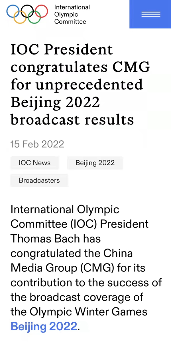 據(jù)國際奧委會官方網(wǎng)站2月15日消息:國際奧委會主席托馬斯·巴赫對中央廣播電視總臺為成功轉(zhuǎn)播報道2022年北京冬奧會所做出的貢獻表示祝賀。