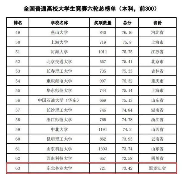 據(jù)悉,中國高等教育學會自2017年2月啟動《高校競賽評估與管理體系研究》項目以來,中國高等教育學會已經(jīng)連續(xù)發(fā)布六輪榜單,這是我國第一個專注高校創(chuàng)新人才培養(yǎng)暨學科競賽成果的排行榜,是檢驗高校人才培養(yǎng)質(zhì)量的重要途徑。為從更長的時間段了解各高校大學生競賽發(fā)展態(tài)勢,特在今年發(fā)布了“六輪總榜單”,時間跨度從2012年到2021年,東北林業(yè)大學以總分73.42,位列全國第63位。
