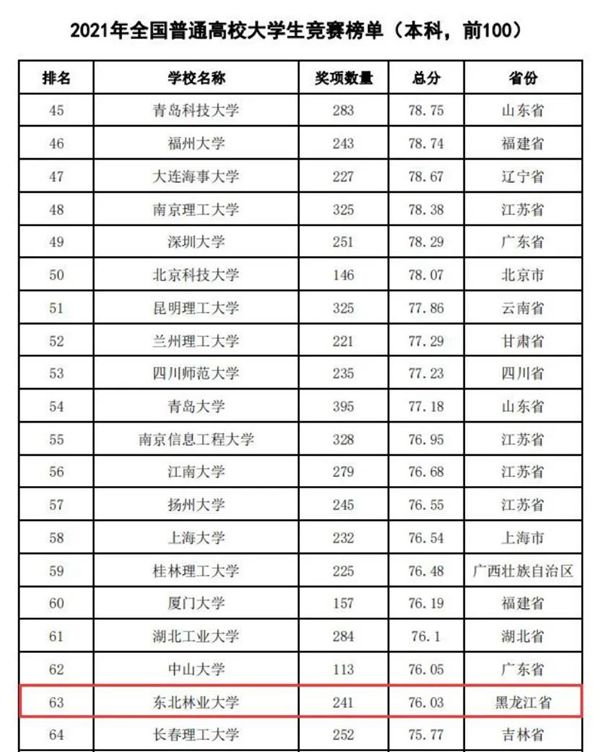 黑龍江經(jīng)濟網(wǎng)訊(黑龍江日報全媒體見習記者董廣碩 商祺)近日,中國高等教育學會高校競賽評估與管理體系研究工作組發(fā)布2021全國普通高校大學生競賽分析報告,在《2017-2021年農(nóng)林類本科院校大學生競賽排行榜TOP20》中。東北林業(yè)大學以總分74.87(獲獎604項)的優(yōu)異成績連續(xù)四年蟬聯(lián)榜首。