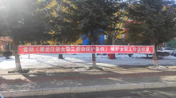 在主要街道懸掛“貫徹《黑龍江省女職工勞動(dòng)保護(hù)條例》 維護(hù)女職工合法權(quán)益”宣傳條幅,提示廣大職工知曉《黑龍江省女職工勞動(dòng)保護(hù)條例》,提醒、督促各單位認(rèn)真貫徹執(zhí)行條例,維護(hù)女職工合法權(quán)益。