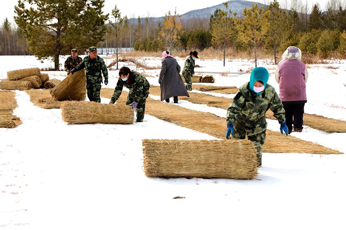 阿木爾林業(yè)局中心苗圃為新播苗木鋪蓋草簾,提升苗木成活率(王力 攝)