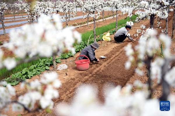 4月5日,山東省臨沂市郯城縣馬頭鎮(zhèn)桑莊村果農(nóng)在梨園里勞作。