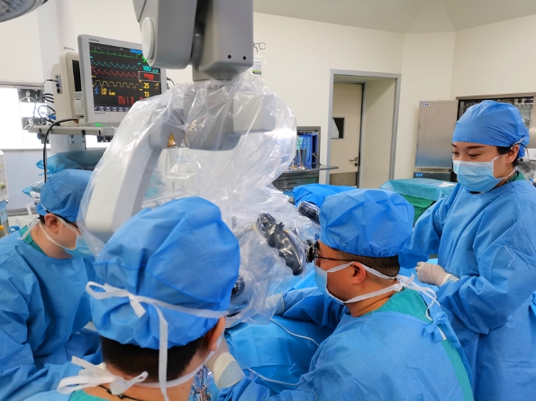 檢查結(jié)果出來后,孫國章主任醫(yī)師建議王女士行右側(cè)顳葉占位切除并行病理檢查。與家屬詳細交代手術(shù)的必要性及相關(guān)風(fēng)險,患者家屬表示知情同意行手術(shù)治療。術(shù)前準備完畢后,孫國章主任醫(yī)師為王女士在全麻下進行了右側(cè)顳葉占位切除+血腫清除術(shù),術(shù)中孫國章主任醫(yī)師在顯微鏡下仔細分離腫瘤組織與腦組織邊界,將腫瘤組織全切并將血腫全部清除,手術(shù)過程順利。王女士術(shù)后恢復(fù)良好,頭部CT復(fù)查顯示腫瘤完全切除,血腫清除徹底,病理回報為腦膠質(zhì)母細胞瘤,現(xiàn)已出院準備進行放化療等下一步綜合治療。