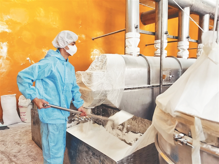 4月18日,新生村溫室大棚內,女村民們忙著往糖渣靈芝菌包里接靈芝菌。靈芝項目負責人肖劍說,木糖渣制備靈芝菌包,先配比混合均勻裝袋,菌包高溫滅菌后接菌、養(yǎng)菌。菌包移棚種植,靈芝出芽后進行芝芽修剪,抽取靈芝噴粉,待一個靈芝種植周期過后,廢棄糖渣菌袋將被回收,粉碎做有機肥入田。