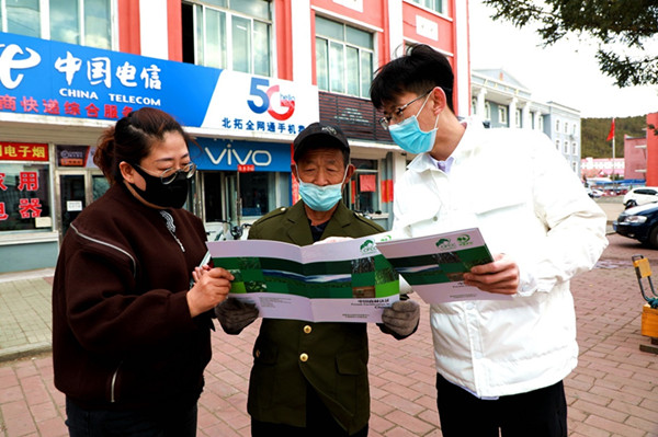 阿木爾林業(yè)局在人員密集場(chǎng)所設(shè)立宣傳站,向職工群眾宣傳森林認(rèn)證相關(guān)知識(shí)(王力 攝)