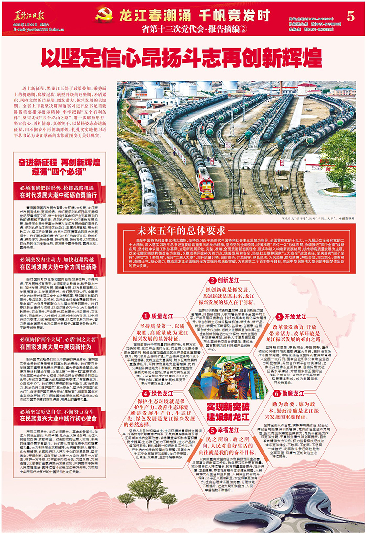 邁上新征程,黑龍江正處于政策疊加、乘勢(shì)而上的機(jī)遇期,爬坡過(guò)坎、轉(zhuǎn)型升級(jí)的攻堅(jiān)期,矛盾累積、風(fēng)險(xiǎn)交織的凸顯期,激發(fā)潛力、振興發(fā)展的關(guān)鍵期。全省上下要堅(jiān)決貫徹落實(shí)習(xí)近平總書記重要講話重要指示批示精神,牢牢把握“五個(gè)有利條件”,堅(jiān)定走好“五個(gè)必由之路”,進(jìn)一步解放思想、堅(jiān)定信心、勇?lián)姑⒄孀?shí)干,以昂揚(yáng)姿態(tài)奮進(jìn)新征程,用不懈奮斗再創(chuàng)新輝煌,扎扎實(shí)實(shí)地把習(xí)近平總書記為龍江擘畫的宏偉藍(lán)圖變?yōu)槊篮矛F(xiàn)實(shí)。
