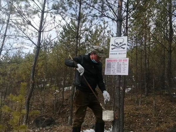 采取科學(xué)有效的防治方法,根據(jù)不同區(qū)域、不同特點投放不孕劑和涂抹防啃劑進行防治。為防止人畜中毒,提前張貼林場鼠害防治公告、在防治區(qū)內(nèi)樹立警示標牌,避免人員、牲畜進入投放鼠藥區(qū)域。