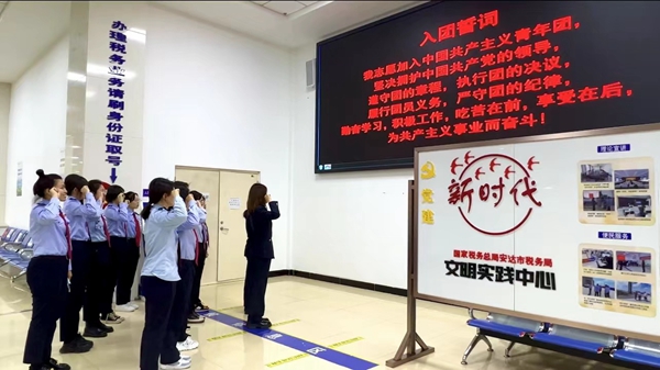 重溫入團(tuán)誓詞,匯聚青春力量。為進(jìn)一步引導(dǎo)廣大團(tuán)員青年厚植愛(ài)國(guó)、愛(ài)黨、愛(ài)稅收事業(yè)的深厚情感,進(jìn)一步增強(qiáng)團(tuán)支部的組織力量,安達(dá)市稅務(wù)局團(tuán)支部開(kāi)展重溫入團(tuán)誓詞活動(dòng),在莊嚴(yán)的團(tuán)歌聲中,11名安達(dá)市稅務(wù)局奮戰(zhàn)在稅收一線的團(tuán)員干部在團(tuán)支部書(shū)記的帶領(lǐng)下,面向誓詞莊嚴(yán)宣誓。宣誓完畢后,安達(dá)稅務(wù)青年紛紛表示,將立足本職、埋頭苦干,用一流的業(yè)務(wù)能力為納稅人繳費(fèi)人帶來(lái)一流的納稅服務(wù)體驗(yàn),為安達(dá)稅收事業(yè)奉獻(xiàn)青春力量。