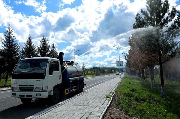 阿木爾林業(yè)局病防站利用噴霧車(chē)對(duì)樟子松綠化樹(shù)木進(jìn)行病蟲(chóng)害防治(王力 攝)