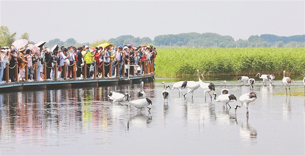 15日,第二個(gè)“鄉(xiāng)約扎龍·情滿(mǎn)鶴城”——“扎龍齊齊哈爾市民日”全面啟動(dòng)。當(dāng)日天藍(lán)水碧,徐徐微風(fēng)拂過(guò),眾多游客來(lái)到國(guó)際重要濕地之一的扎龍濕地感受濕地風(fēng)光的壯闊之美,欣賞鶴舞云翔的自然之美。馬麗娟 宋燕軍 黑龍江日?qǐng)?bào)全媒體記者 姚建平攝