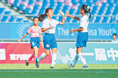 7月10日,在第一屆中國(guó)青少年足球聯(lián)賽(浙江賽區(qū))女子小學(xué)U12組比賽中,杭州長(zhǎng)陽(yáng)小學(xué)的小球員彭紫萱(中)進(jìn)球后與隊(duì)友鄧語(yǔ)菲擊掌慶祝。