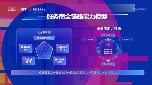 快手電商服務(wù)商則介紹了服務(wù)商全鏈路能力模型。針對商家主播能力弱、私域流量差、貨品不健全、投流ROI難提升等痛點(diǎn),服務(wù)商可以發(fā)揮流量營銷、直播運(yùn)營、主播孵化、供應(yīng)鏈、服務(wù)履約等全鏈路能力,助力商家冷啟孵化和躍遷。自今年3月底常熟服飾產(chǎn)業(yè)帶落地至今,快手服務(wù)商已服務(wù)500多個常熟商家,常熟當(dāng)?shù)乜焓謩愉N商家數(shù)提升30%+。