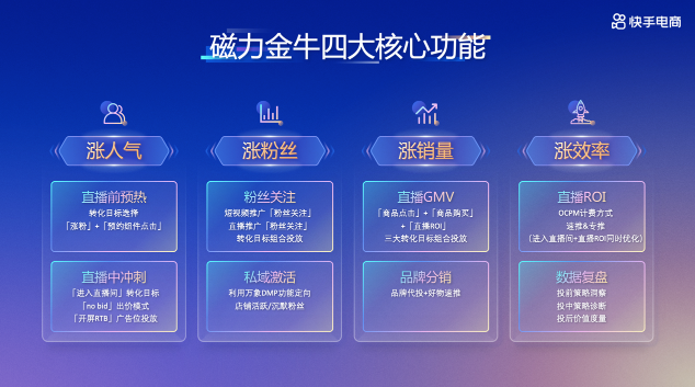 本次活動,快手磁力金牛和快手電商服務(wù)商也宣布推出一系列政策,推動常熟女裝商家電商生意增長。作為電商生意的加速器,快手磁力金牛讓商家投流更精準(zhǔn)、效率更高、效果更好。在賬號啟動期,商家可借助磁力金牛進(jìn)行私域起量,并根據(jù)貨盤制定營銷策略;在賬號成長期,商家可依據(jù)S-A-B直播策略模型,使用磁力金牛進(jìn)行差異化投流、精細(xì)化運(yùn)營;在賬號成熟期,磁力金牛可以在品效協(xié)同下進(jìn)行差異化拓客,引入新流量。