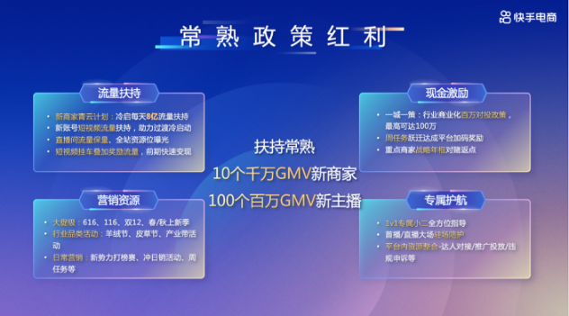 在流量扶持方面,新手常熟商家可享受“青云計(jì)劃”每天8億流量扶持,還有短視頻流量扶持、直播間流量保量、全站資源位曝光、短視頻掛車疊加獎勵等;在營銷資源方面,快手電商打造每月高頻的營銷場景,包括大促、節(jié)日、行業(yè)品類活動、寵粉節(jié)等,并為常熟商家提供活動補(bǔ)貼,激活品牌動銷;此外還有最高價值100萬的商業(yè)化對投政策、周任務(wù)躍遷達(dá)成平臺加碼獎勵等現(xiàn)金激勵,以及1V1專屬小二全方位指導(dǎo)等專屬護(hù)航。