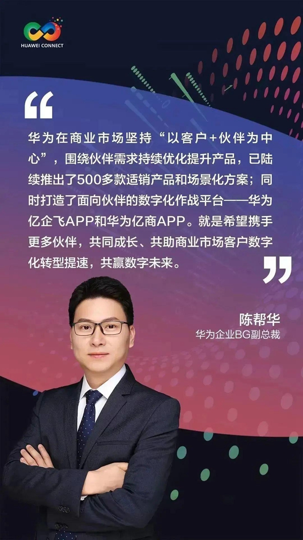 對此,陳幫華表示,華為在商業(yè)市場堅(jiān)持“以客戶+伙伴為中心”,圍繞伙伴需求持續(xù)優(yōu)化提升產(chǎn)品,已陸續(xù)推出了500多款適銷產(chǎn)品和場景化方案;同時(shí)打造了面向伙伴的數(shù)字化作戰(zhàn)平臺——華為億企飛APP和華為億商APP。就是希望攜手更多伙伴,共同成長、共助商業(yè)市場客戶數(shù)字化轉(zhuǎn)型提速,共贏數(shù)字未來。