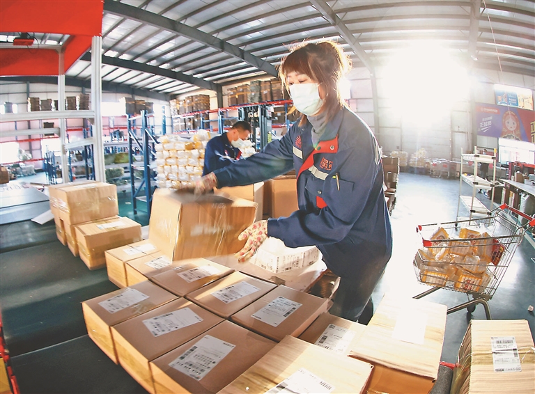 俄品多倉儲(chǔ)配送中心工作人員包裝配送線上商品。