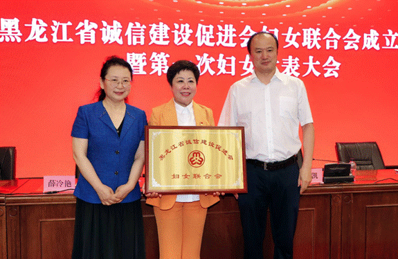 省直機(jī)關(guān)工委副書記、全省性社會(huì)組織黨委書記徐凱,省婦女聯(lián)合會(huì)黨組成員、省政府婦兒工委辦主任姜秀麗為黑龍江省誠(chéng)信建設(shè)促進(jìn)會(huì)婦女聯(lián)合會(huì)頒發(fā)牌匾。