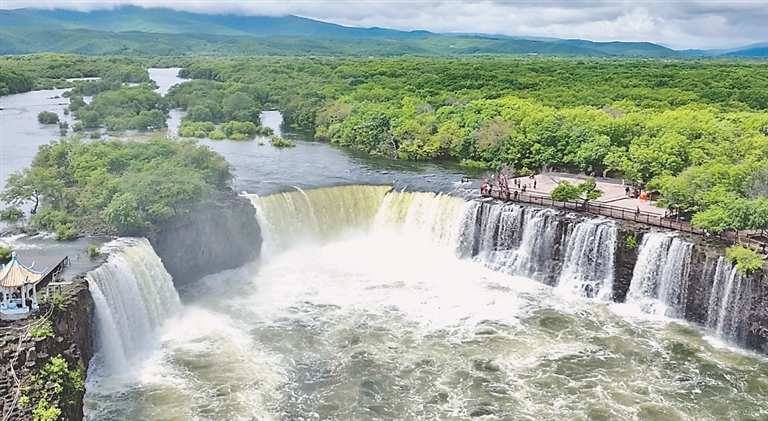 記者從景區(qū)管委會(huì)獲悉,由于連日降水,鏡泊湖吊水樓瀑布在今年首次出現(xiàn)三面飛瀑景觀,站在觀景長(zhǎng)廊能看到三面環(huán)水的壯觀景象。近看瀑布水流一路狂奔,氣勢(shì)恢宏,無比震撼。