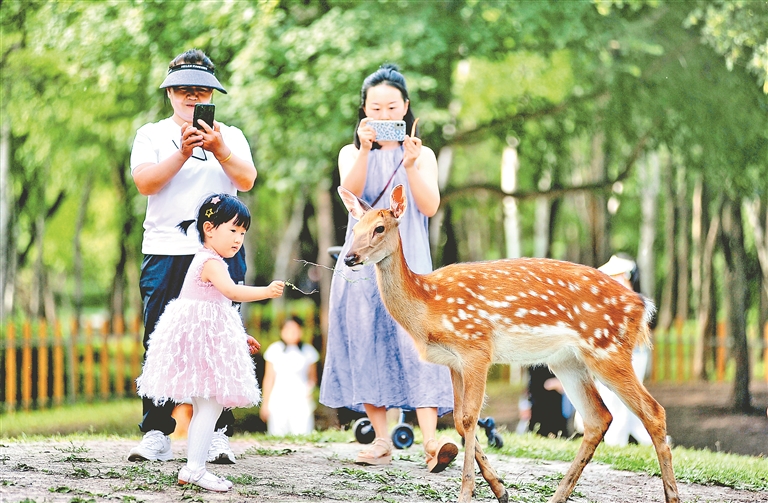 16日,陽光明媚,空氣清新,哈爾濱市迎來了好天氣。太陽島上,草木茂盛,百花爭艷,許多本地市民和南方游客組團(tuán)來到這里避暑游玩。有的游人搭起帳篷野餐,有的游人走上濕地棧道觀賞美麗風(fēng)景。孩子們玩過各種游樂項目后,再與小鹿、松鼠等小動物來個親密接觸。