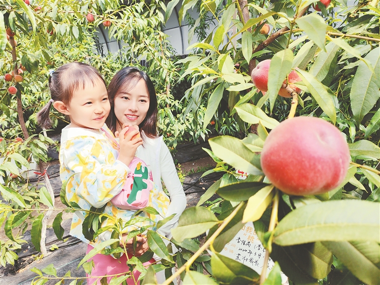 “我認(rèn)養(yǎng)了一棵桃樹,今天和妻子共同看看桃子的長(zhǎng)勢(shì),過些天就可以親自采摘了。”關(guān)勇和妻子正在查看認(rèn)養(yǎng)的桃樹。
