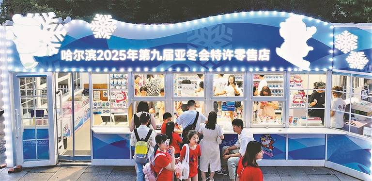 6月29日,第九屆亞冬會(huì)特許零售店哈爾濱索菲亞教堂店,游客在琳瑯滿目的貨品中挑選心儀的款式。