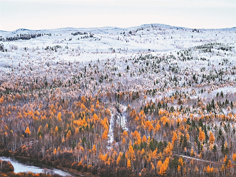 從空中俯瞰最北邊城儼然已經(jīng)進(jìn)入冬季。眼下正值漠河的金秋時(shí)節(jié),突如其來的降雪為北國秋色增添了別樣美景。松枝上布滿了厚厚的雪球,山林之間的秋色景觀與皚皚白雪同框,火車在白雪森林間穿行而過,令南方游客驚嘆不已。本報(bào)記者 張磊攝