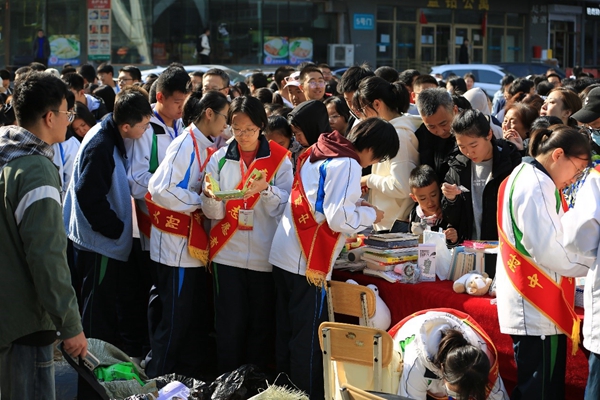 10月13日9:30時(shí),義賣(mài)會(huì)正式開(kāi)幕。出席開(kāi)幕式的嘉賓有:黑龍江省希望工程捐助中心主任杜晶,哈師大附中黨委書(shū)記張靜萍、哈師大附中校長(zhǎng)劉振成、哈師大附中副校長(zhǎng)秦毅,黑龍江省實(shí)驗(yàn)中學(xué)團(tuán)委書(shū)記韓宇,哈19中團(tuán)委書(shū)記張綰,工大附中初中部團(tuán)委書(shū)記耿冬穎,哈師大附中學(xué)生處主任劉治軍、副主任陳明濤。哈師大附中團(tuán)委書(shū)記唐丹丹首先介紹了附中志愿活動(dòng)的歷史和本次義賣(mài)的意義,并向哈爾濱師范大學(xué)、哈爾濱工程大學(xué)、黑龍江省實(shí)驗(yàn)中學(xué)、哈爾濱市第十九中學(xué)、哈工大附屬中學(xué)初中部、哈爾濱市閩江小學(xué)、哈爾濱市青年宮少年新聞學(xué)院、哈爾濱學(xué)府凱德團(tuán)隊(duì)等義賣(mài)團(tuán)隊(duì)成員和聞?dòng)嵹s來(lái)的學(xué)生、家長(zhǎng)、市民、商場(chǎng)顧客們表示歡迎和感謝。