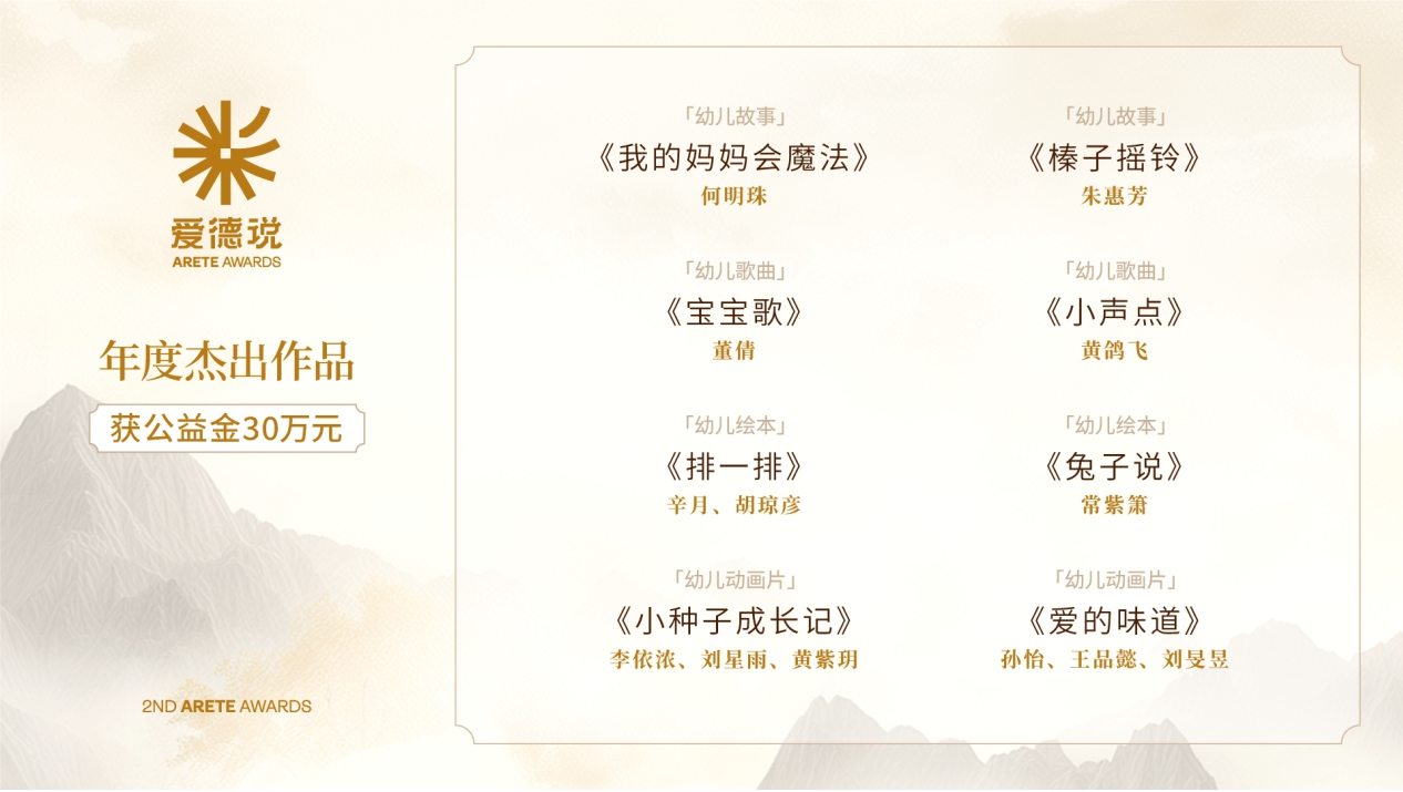 揭曉盛典上,幼兒故事《我的媽媽會(huì)魔法》《榛子搖鈴》,幼兒歌曲《寶寶歌》《小聲點(diǎn)》,幼兒繪本《排一排》《兔子說(shuō)》及幼兒動(dòng)畫片《小種子成長(zhǎng)記》《愛(ài)的味道》8部作品獲評(píng)第二屆“愛(ài)德說(shuō)”幼兒德育作品征集活動(dòng)“年度杰出作品”,每部作品獲得主辦方提供的公益金人民幣30萬(wàn)元。