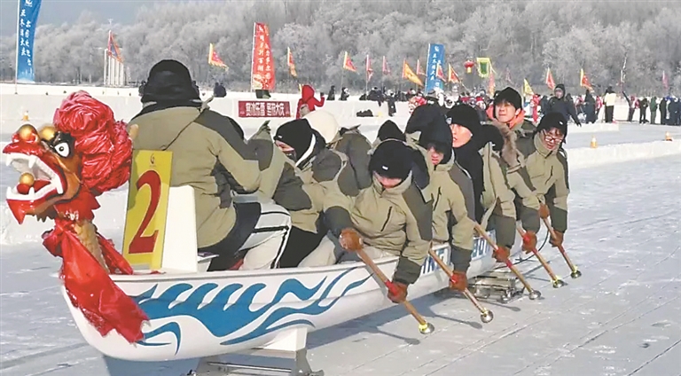 伴隨著動(dòng)感的音樂(lè)聲和歡呼聲,冰面之上百釬齊發(fā),龍舟疾馳。隊(duì)員們劃槳?jiǎng)幼髡R劃一,鑼鼓聲、吶喊聲形成了一曲激昂的冬日交響樂(lè)。當(dāng)冠軍隊(duì)伍沖線(xiàn)的一刻,現(xiàn)場(chǎng)爆發(fā)出更熱烈的歡呼聲,豪邁的氣勢(shì)與聲浪響徹萬(wàn)寶湖上空。
