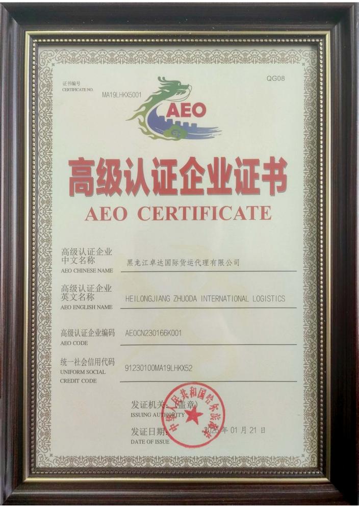 圖1黑龍江卓達(dá)國(guó)際貨運(yùn)代理有限公司AEO認(rèn)證證書