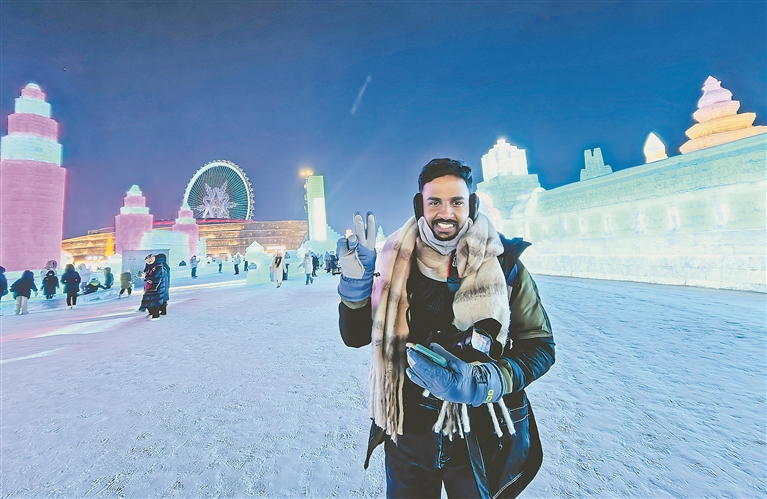 夜幕降臨,園區(qū)里五彩斑斕。徜徉其中,記者不時(shí)與遠(yuǎn)道而來(lái)的國(guó)際友人擦肩而過(guò)。印度游客庫(kù)洲倫一路走走停停,仿佛一位尋寶者,在冰雪編織的夢(mèng)幻王國(guó)中盡情探索。他胸前挎著一臺(tái)單反相機(jī),手中握著手機(jī),眼中閃爍著滿滿的驚奇。每一次駐足,每一次與冰雕雪塑的凝視,都伴隨著按下相機(jī)快門(mén)的聲響。