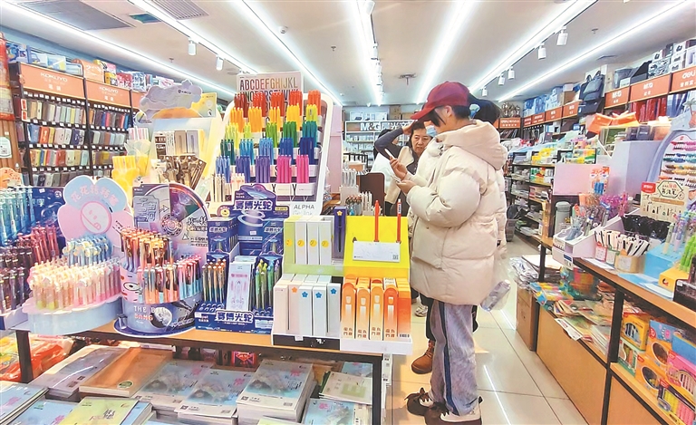 在文教用品專柜里,各種筆記本、款式新穎的筆、不同顏色的文具盒、書包等琳瑯滿目,應(yīng)有盡有。銷售人員介紹,新學(xué)期即將開始,文具的銷售量持續(xù)增多。家長為孩子挑選文具時(shí),更傾向于選擇環(huán)保的產(chǎn)品。