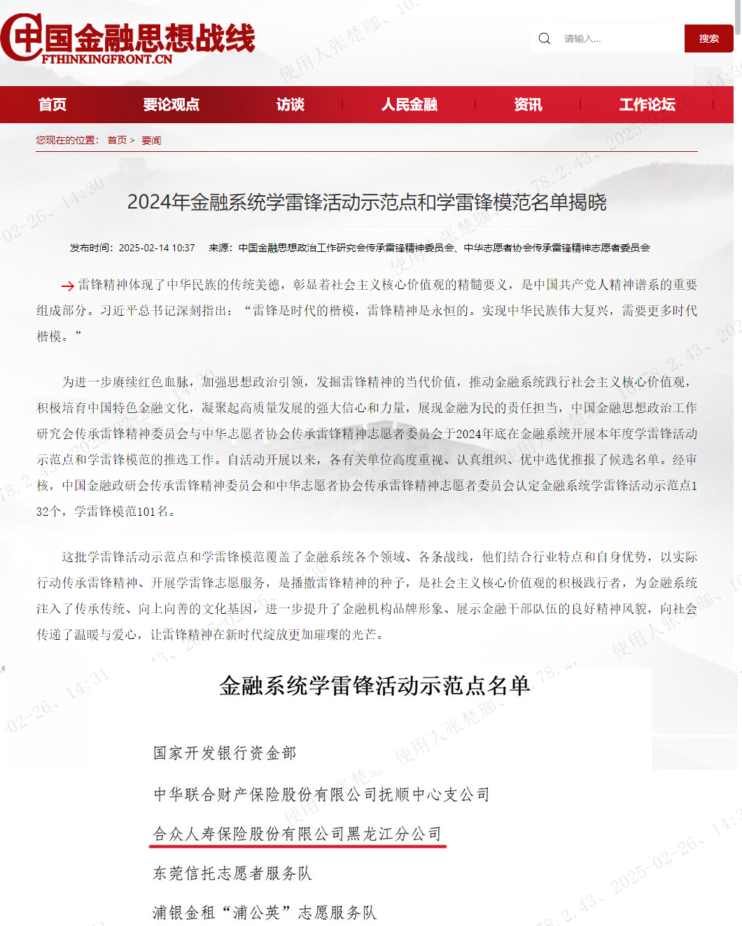 合眾人壽黑龍江分公司榮獲2024年金融系統學雷鋒示范點稱號