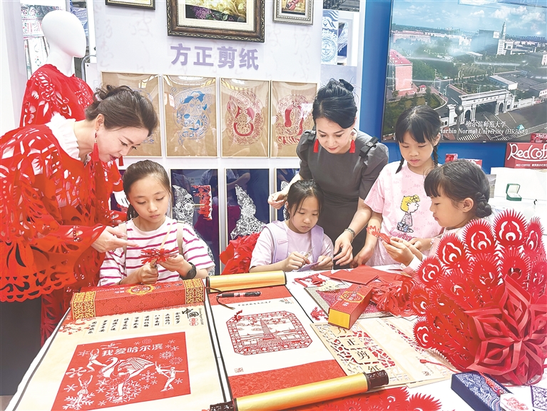 方正剪紙展區(qū)工作人員把剪紙穿在身上,手把手輔導(dǎo)小觀眾體驗(yàn)剪紙技藝。本報(bào)記者 韓東賢攝