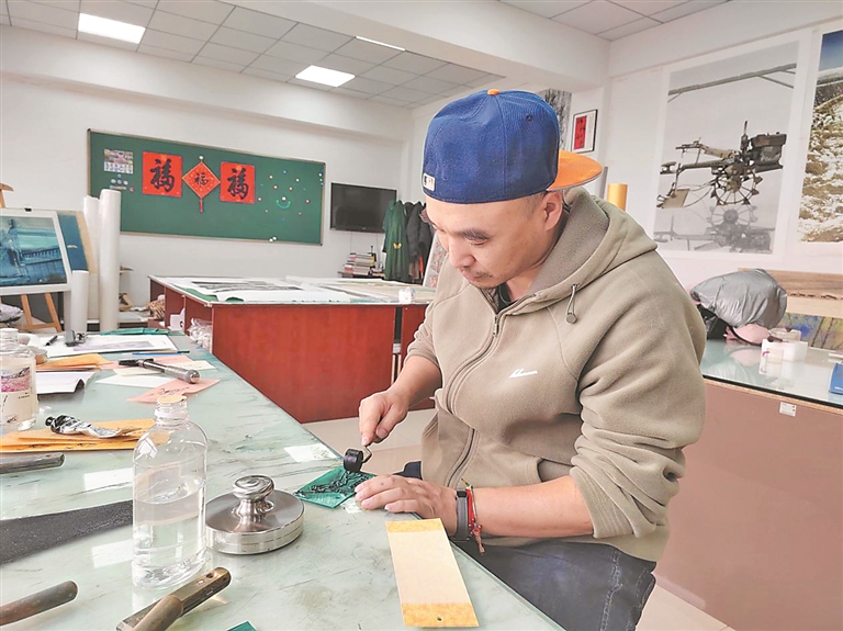 慶安版畫是黑龍江省非物質(zhì)文化遺產(chǎn)代表性項目,始于20世紀初。創(chuàng)始人吳盡臣將河北樂亭的木刻技藝帶到這片黑土地,最初以雕刻門神、福字等民俗圖案為主題,突出節(jié)日的喜慶和吉祥氣氛,表達人們對美好未來的企盼和追求。20世紀60年代中期,幾位著名的北大荒畫家到慶安工作,精心指導民俗年畫作者創(chuàng)作版畫,將慶安民俗版畫和北大荒版畫創(chuàng)作相互交融。歷經(jīng)四代傳承,吳蔚的父親吳玉林將題材拓展,用細膩刀法展現(xiàn)慶安的春播秋收、田園生活,在傳承中不斷創(chuàng)新;而吳蔚則把冰雪元素融入版畫創(chuàng)作,將千里冰封的壯美轉(zhuǎn)化為木板上的立體紋理?!袄献孀诹粝碌募妓嚥荒軄G,但作品題材和技法也要與時俱進,推陳出新?!眳俏当硎?,他們的創(chuàng)作團隊不僅深入田間地頭、林海雪原采風,用刻刀記錄黑土地的獨特風情,也緊盯時事熱點,呈現(xiàn)新時代的主流價值。