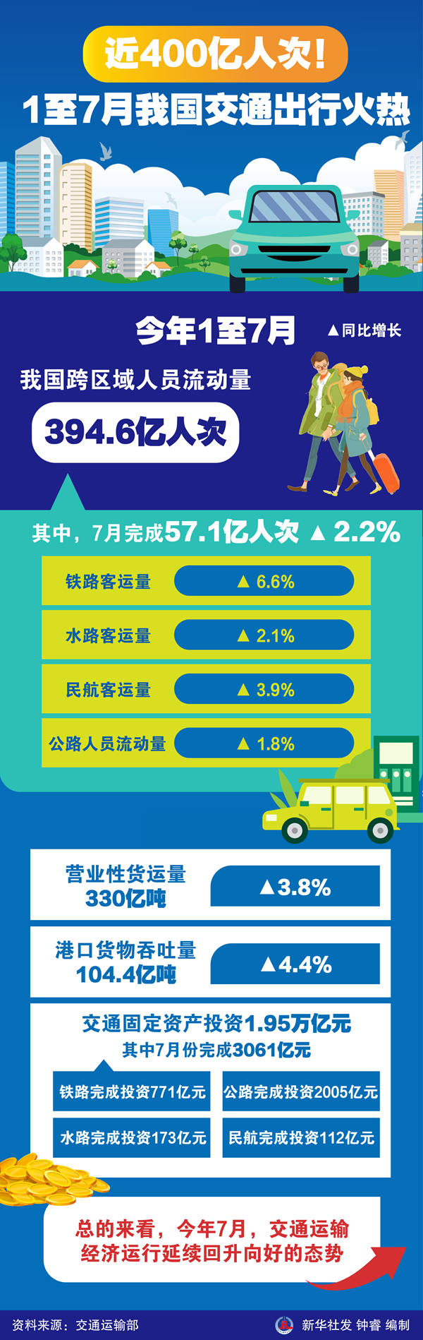 “7月份,完成跨區(qū)域人員流動(dòng)量57.1億人次,同比增長(zhǎng)2.2%,增速較上月回升0.7個(gè)百分點(diǎn)。分方式看,鐵路、水路、民航客運(yùn)量同比分別增長(zhǎng)6.6%、2.1%和3.9%,公路人員流動(dòng)量同比增長(zhǎng)1.8%。”交通運(yùn)輸部新聞發(fā)言人李穎說。