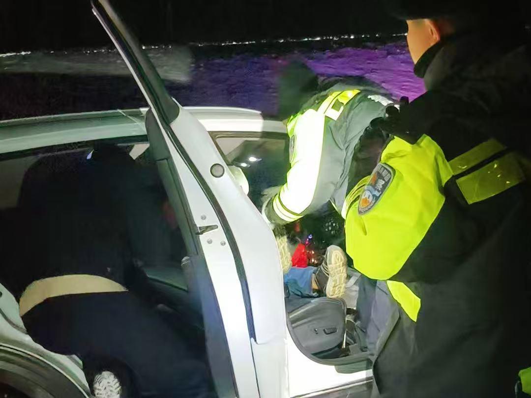 抵達(dá)現(xiàn)場(chǎng)后,民輔警第一時(shí)間查看被困人員狀態(tài),通過(guò)簡(jiǎn)單詢(xún)問(wèn),確認(rèn)無(wú)人員受傷,隨即立刻展開(kāi)低溫救援,由于溝坡陡滑,常規(guī)救援設(shè)備無(wú)法使用。民輔警毫不猶豫地滑下溝底,并迅速?gòu)母瘪{駛展開(kāi)救援,經(jīng)過(guò)不懈努力,十分鐘后成功將被困人員從車(chē)內(nèi)救出。隨后,民輔警主動(dòng)幫助聯(lián)系拖車(chē)公司將車(chē)輛送至維修廠檢修,并用警車(chē)將游客接回派出所安置。抵達(dá)白銀納派出所后,值班輔警遞出早已準(zhǔn)備好的熱水和蛋糕?!皽囟冗_(dá)到零下36℃,手機(jī)凍得即將關(guān)機(jī),還好有人民警察幫忙,不然真的不知道該怎么辦了?!北痪戎罕姼屑さ恼f(shuō)道。